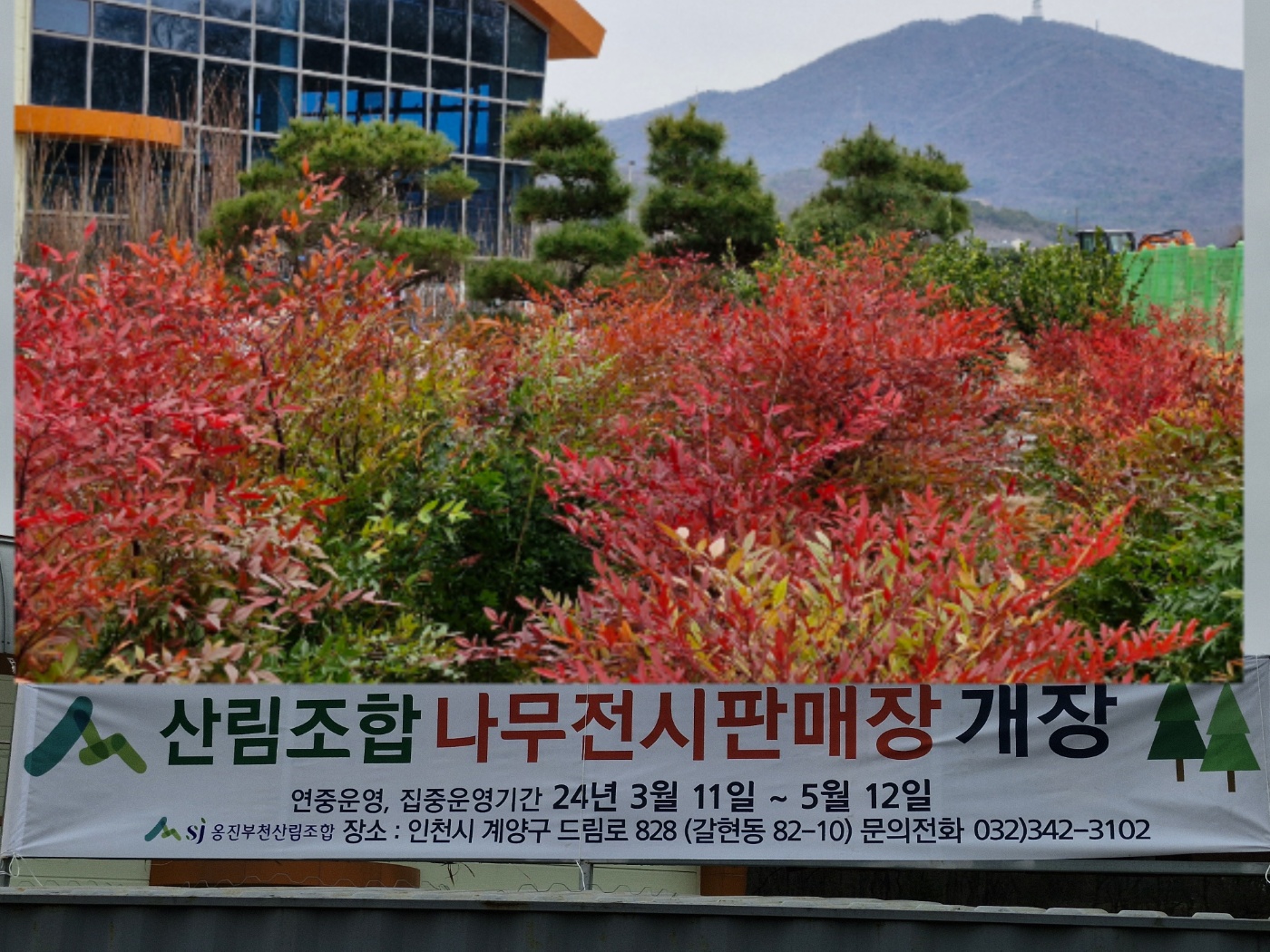 2024년 옹진부천산림조합 나무전시판매장 개장안내운영기간: 2024년 3월 11일 ~ 5월 12일장 소 : 인천시 계양구 드림로 828 (갈현동 82-10)문의전화 : 032)342-3102