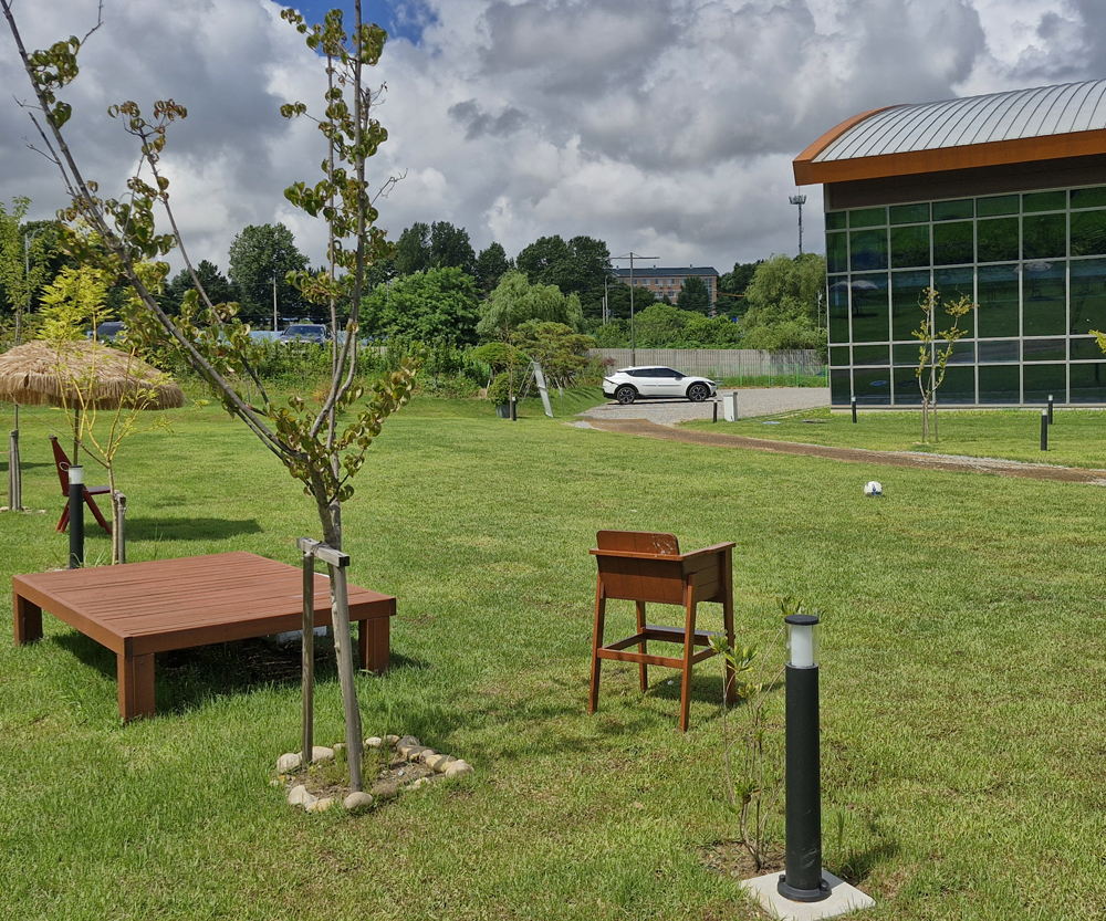 잔디밭의 평상과 나무는 인공과 자연이 가장 조화롭게 만나는 작은 쉼터입니다.