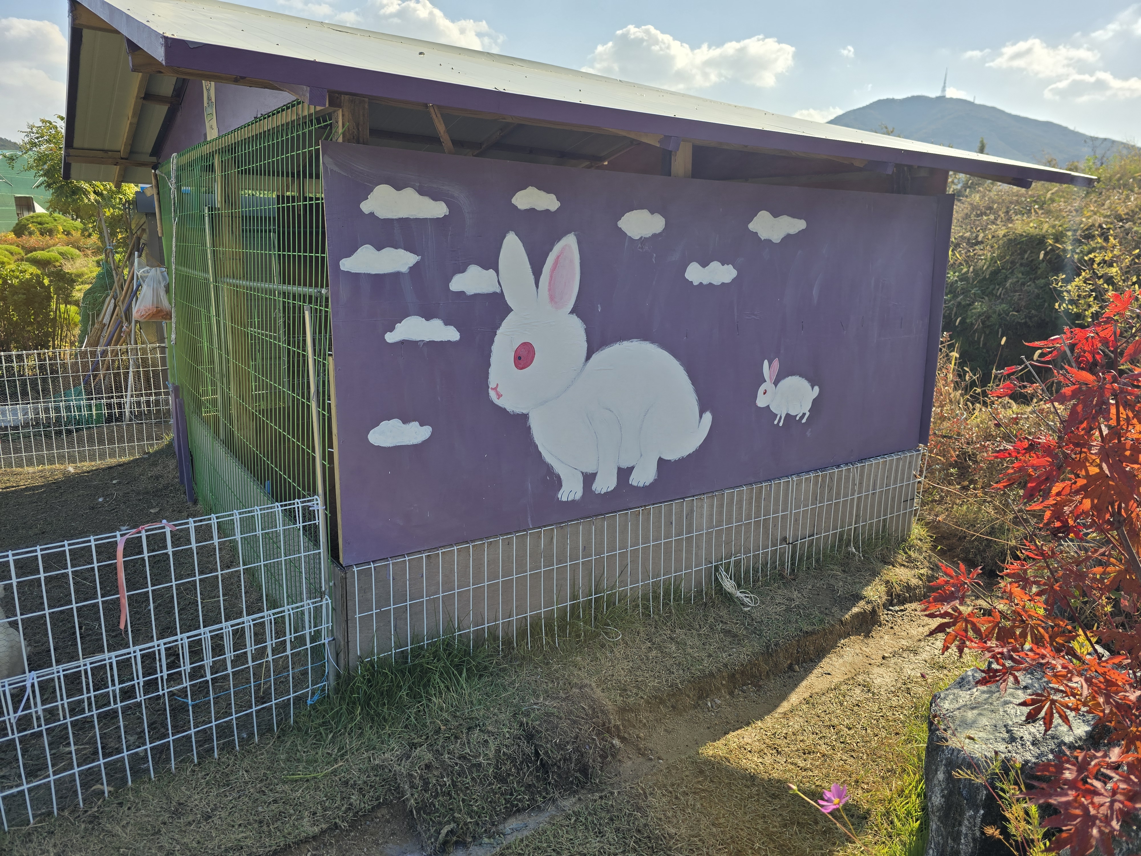 흰 토끼 두마리가 함께 걷는 모습, 따뜻한 위로와 평화로운 감정을 느끼게 한다.