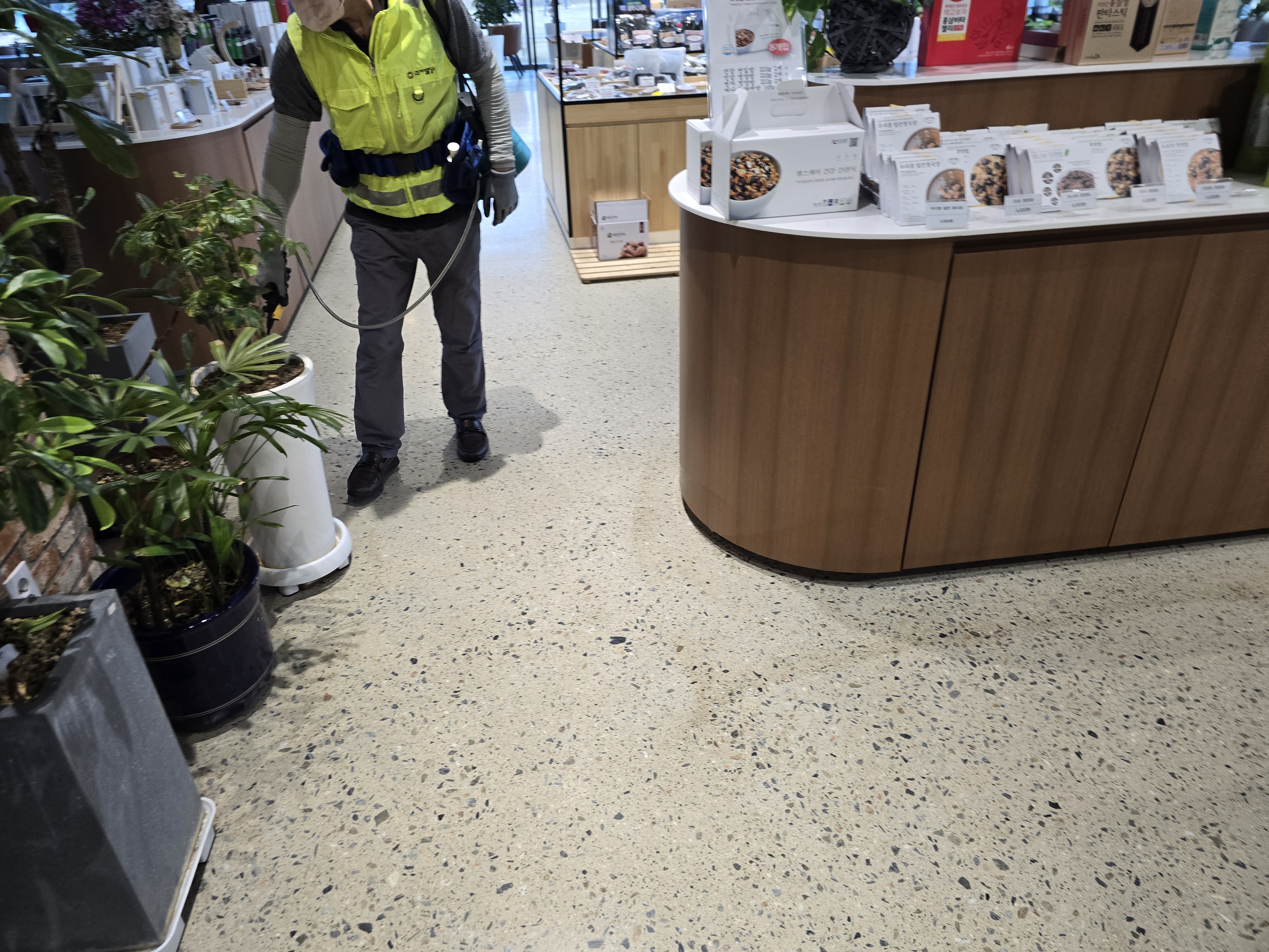 ※ 임산물유통센터 내.외부 및 숲 카페의 보건 환경 위생관리에 철저를 기하기 위하여 월 1회 정기 방역소독을 실시 하는 모습 입니다.