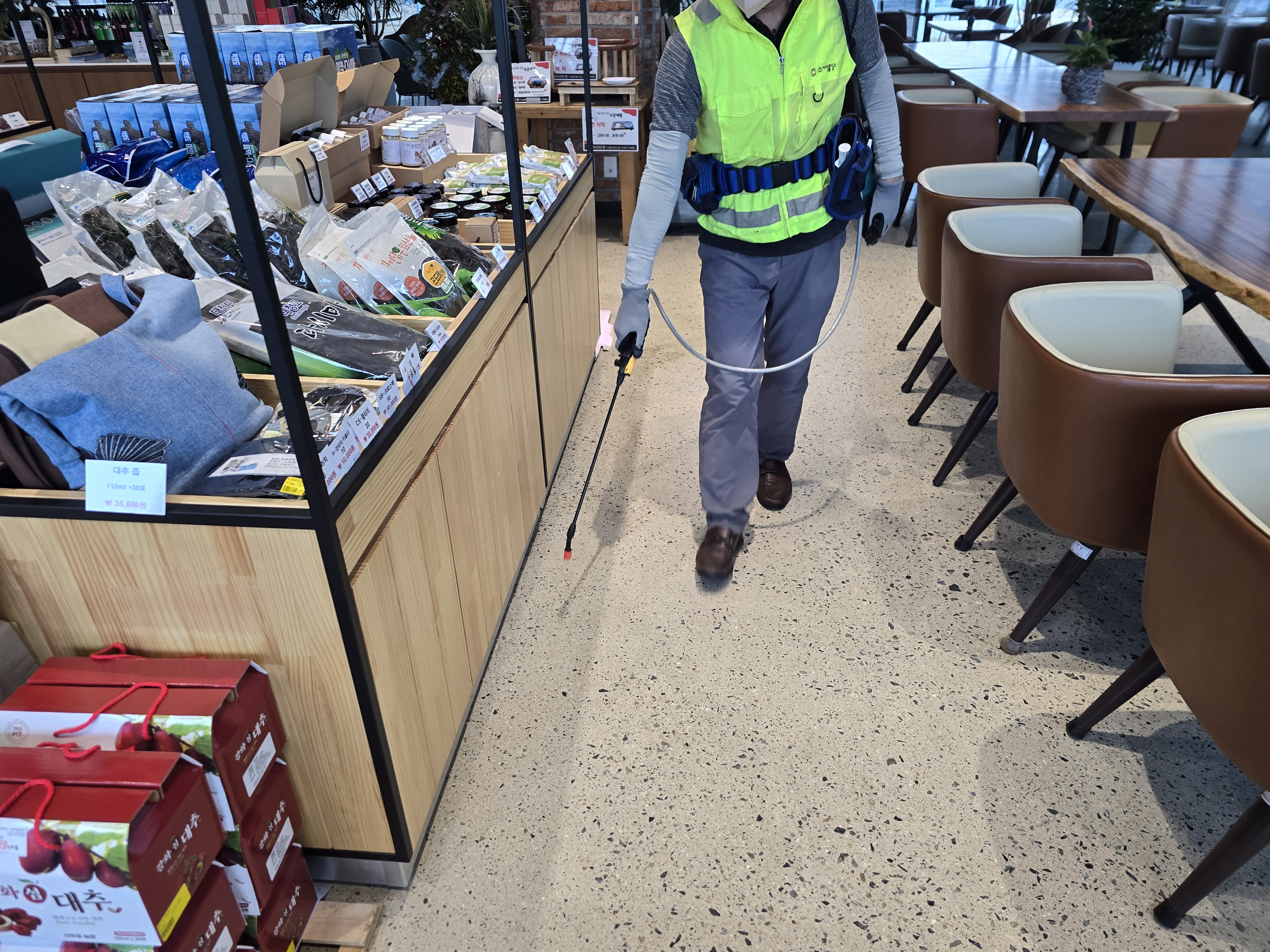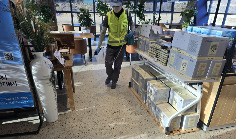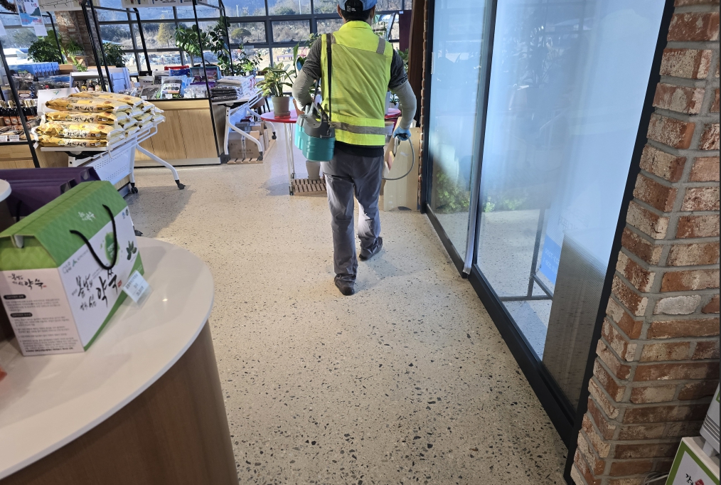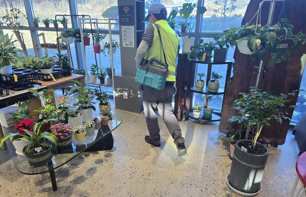 ※ 임산물유통센터 내.외부 및 숲 카페의 보건 환경 위생관리에 철저를 기하기 위하여 월 1회 정기 방역소독을 실시 하는 모습 입니다.