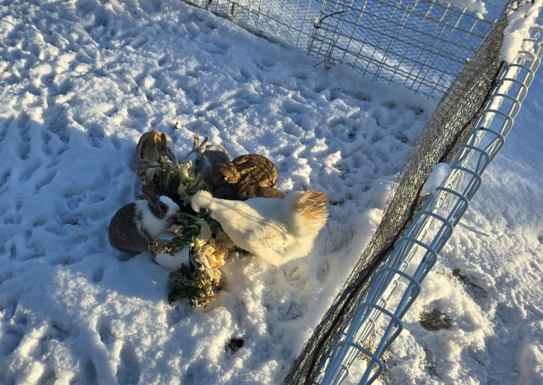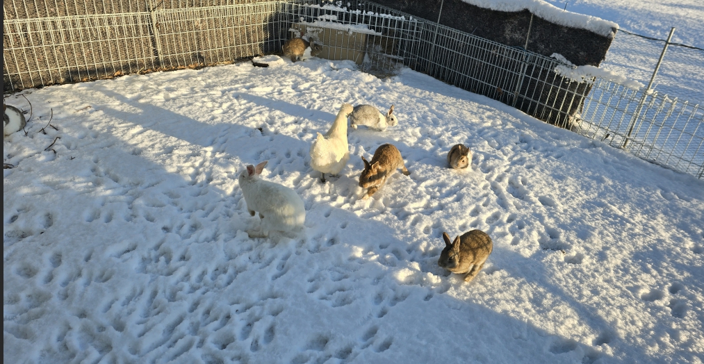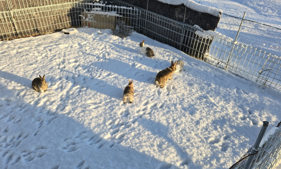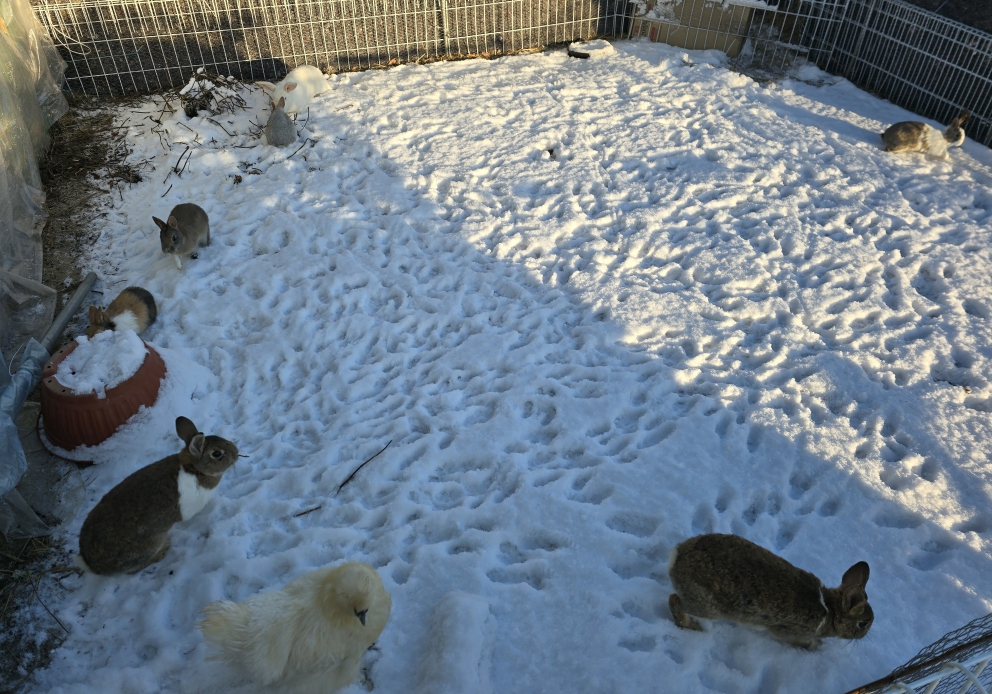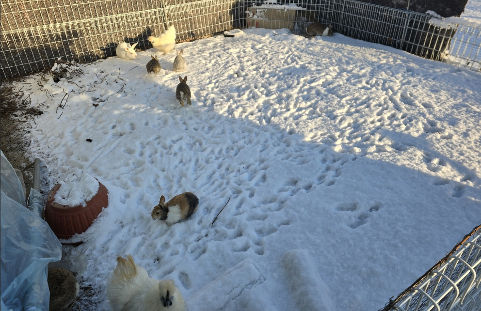 | 눈이 소복이 쌓인 사육장에서 토끼들이 하얀 눈 위를 통통 튀며 이리저리 뛰어놀고 있다. | |||